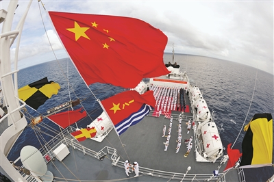 “和平方舟”號醫院船在大洋上舉行隆重升旗儀式。江 山攝
