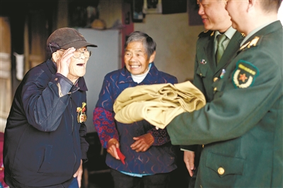 “老前輩,我是人武部的,今天來給您送軍裝,您看是不是和您當年在抗美援朝戰場上穿的一樣?”洞口縣人武部部長陳天文雙手托起一件舊式軍裝,送到楊建成老人面前。