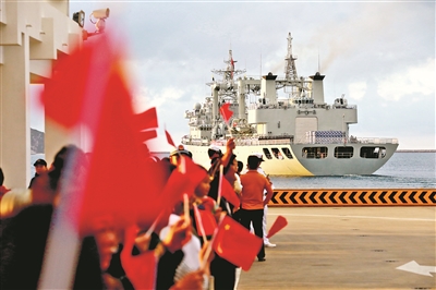 “編隊準備完畢,請示起航!”編隊指揮員向南部戰區海軍領導報告后,軍樂隊奏響《歡送進行曲》,編隊各艦依次解纜,緩緩駛離碼頭。甲板上,任務官兵整齊列隊,向祖國和人民莊嚴敬禮、揮手告別。