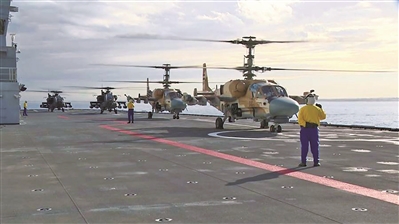 卡-52“短吻鱷”(前兩架)與AH-64D“阿帕奇”(后兩架)同艦亮相
