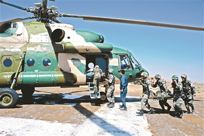 某聯勤保障旅衛生營在演習中用直升機后送傷員。張放 攝