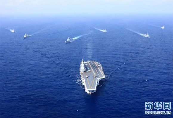 2018年4月18日,執行遠海訓練任務的遼寧艦編隊在西太平洋海域組織編隊運動訓練。新華社發(胡鍇冰攝)