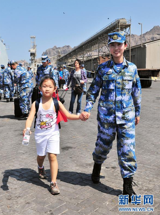 2015年3月29日,中國海軍第19批護航編隊臨沂艦抵達也門亞丁港,女艦員郭燕幫助撤離的兒童登艦。新華社發(熊利兵攝)