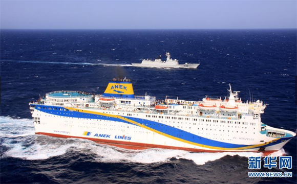 2011年3月1日,徐州艦為撤離我在利比亞同胞的船舶護航。新華社發(李高健攝)