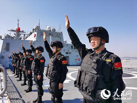 中國海軍第35批護航編隊特戰隊員在甲板揮手告別。江山 攝