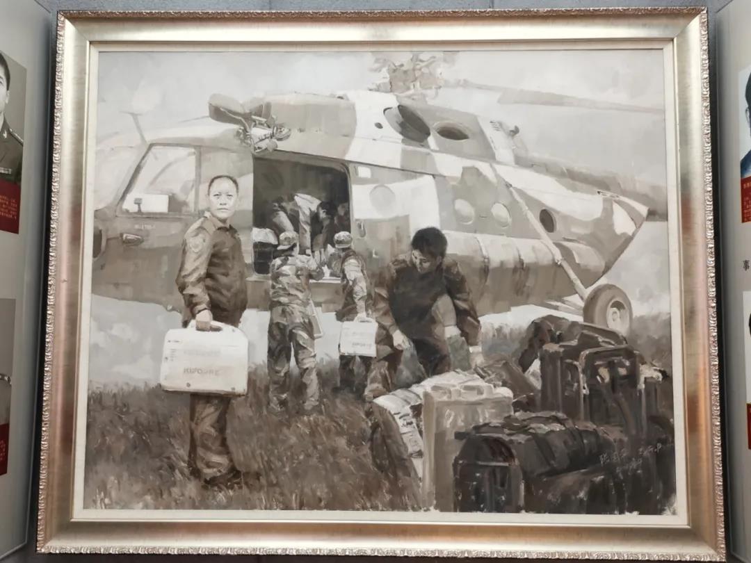 旅史館內,一張巨幅油畫引人注目。畫面中,5名機組成員正忙著將救災物資搬上直升機。