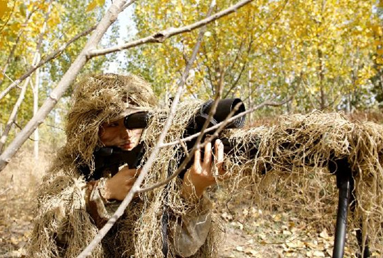 白宇曦在樹林中進行狙擊訓練。段玉洋 攝