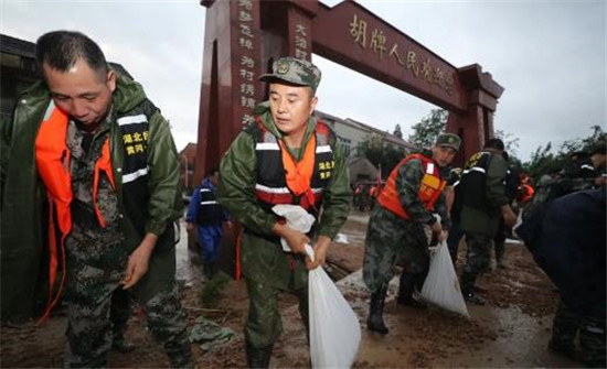連日強降雨導致策湖水位暴漲,接到地方請求后,湖北省黃石港區人武部緊急出動60名民兵應急隊員趕赴救援。經過連夜奮戰,堤壩得到加固,確保了沿岸群眾生命財產安全。