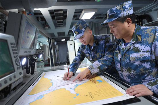 7月10日,海軍第35批護航編隊航海業務長王培敬(右一)指導太原艦航海干部進行海圖作業。