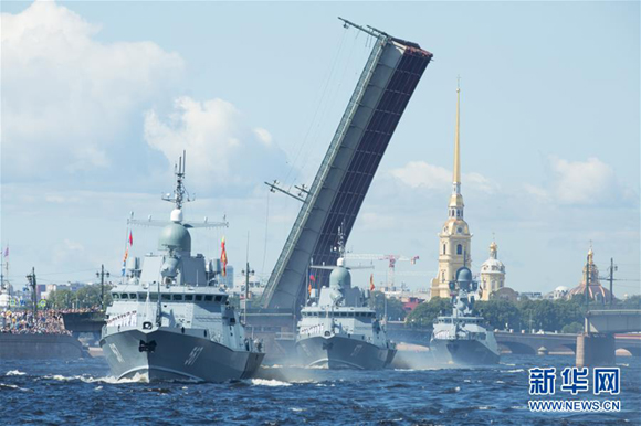 7月26日,在俄羅斯圣彼得堡, 艦艇列隊參加海軍節慶;顒。 新華社發(莫京娜攝)