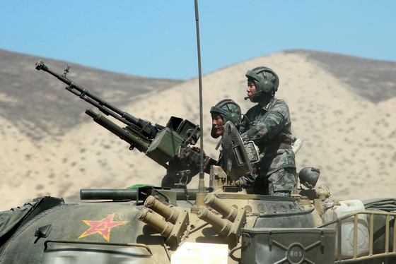 新疆軍區某合成團坦克二連政治指導員馬和帕麗(右一)組織戰術訓練的情景。(攝影:袁凱)
