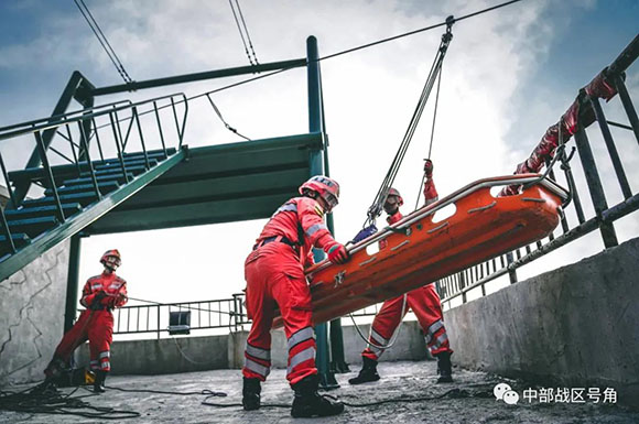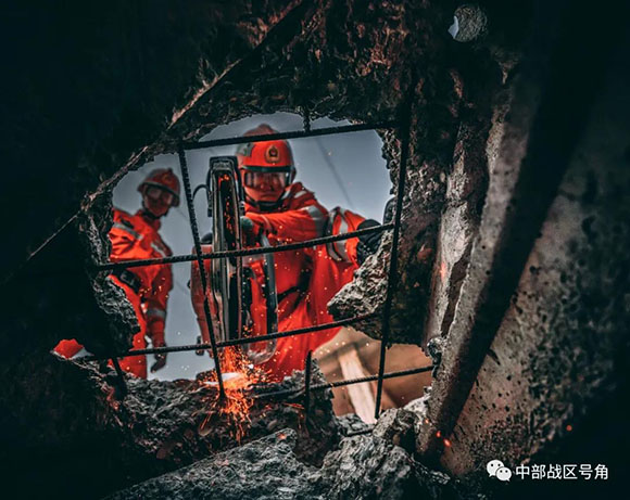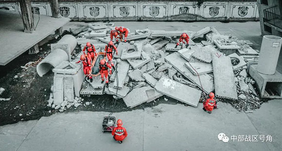 演練中,工兵分隊官兵按照預先號令進入坍塌樓體,迅速勘察現場、搜集信息,按照行動劃分小組和區域展開搜索救援。人犬搜救組率先進入事發區域,了解災害現場情況,救援組利用生命探測儀器對幸存者覆蓋式摸排,導調組通過臨機給出幸存者信息,考驗救援隊員現場靈活處置能力。在各專業分隊的密切協同下,營救一組順利打通救援通道,轉運“傷員”。營救二組利用高空救援裝備,全方位搜救其余“被困人員”。