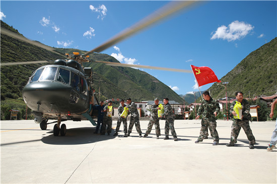 驟雨初歇,甘肅隴南機場傳來直升機螺旋槳的呼嘯聲。8月24日9時20分,奔赴甘肅隴南救災的西部戰區陸軍第76集團軍某陸航旅再次出動三架運輸直升機,兵分三路飛赴甘南藏族自治州舟曲縣李子坪村、中寨鎮、博峪鄉,展開救援行動。