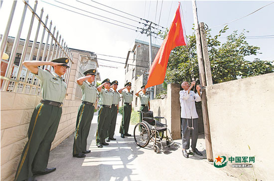 從那以后,中隊官兵每逢建黨、國慶等重要紀念日,都會來到黃孝榮家中一同升國旗,接受紅色傳統教育,并先后贈送21面國旗。