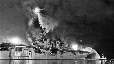 2020年7月14日,在美國加利福尼亞州圣迭戈海軍基地,直升機參與“好人理查德”號兩棲攻擊艦的滅火工作。 資料圖片