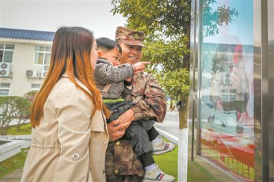 班長羅錚是一名無人機維修技師,因成績突出榮立三等功并登上營區“C位”燈箱。休息時間,羅錚帶著妻兒觀看燈箱上的自己,臉上寫滿自豪與幸福。農討光 攝