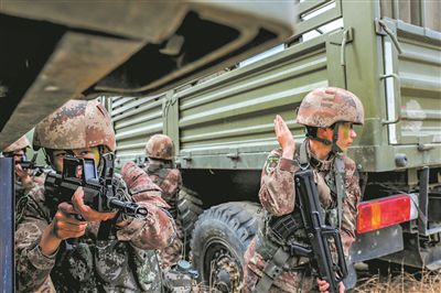 “全班注意!前方發現‘敵’情……”研判目標區域態勢后,班長馮坤娜下達作戰命令。隨即,狙擊手快速占領高地,對“敵”進行警戒;無人機操作手放飛無人機實施偵察,將相關信息實時上報指揮中心;突擊組向“敵”警戒區域隱蔽滲透……