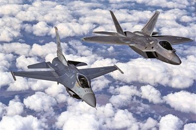 美空軍F-22戰機(右)與F-16戰機(左)進行聯合訓練