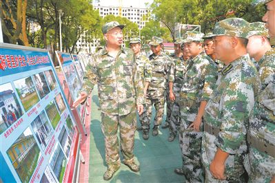吳劍鋒在展板前為人武部官兵和民兵講標語背后的故事。宋錦輝攝