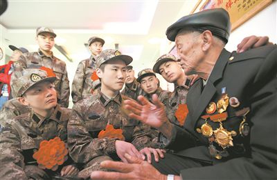 柴云振給來家中探望、即將啟程奔赴軍營的新兵們講述戰斗故事(資料照片)。新華社發