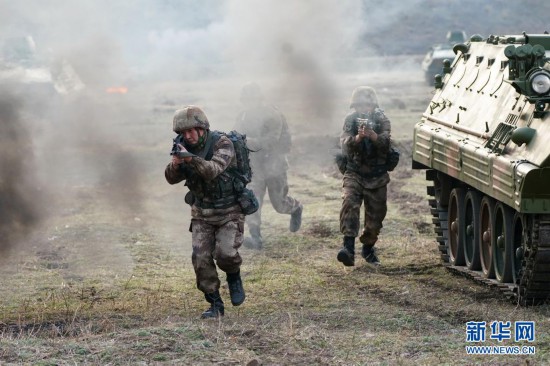 對抗演練中,陸軍第83集團軍某旅“紅一連”官兵下車戰斗(3月3日攝)。新華社記者 張永進 攝