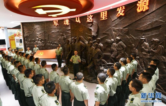 在陸軍第83集團軍某旅“紅一連”連史館“軍魂從這里發源”雕塑前,指導員鄭紀文(中)為官兵講述“支部建在連上”的光榮歷史(7月4日攝)。新華社記者 張永進 攝