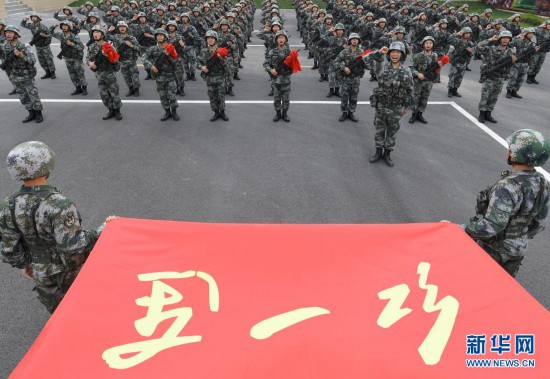 陸軍第83集團軍某旅“紅一連”為新戰士授槍后,全連官兵在連隊榮譽旗前宣誓(7月4日攝)。新華社記者 張永進 攝