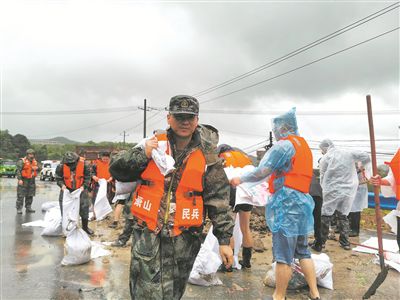 7月25日,紹興市上虞區人武部緊急派出50名民兵趕赴陳溪鄉加固堤壩,確保人民群眾生命財產安全。施炯輝攝