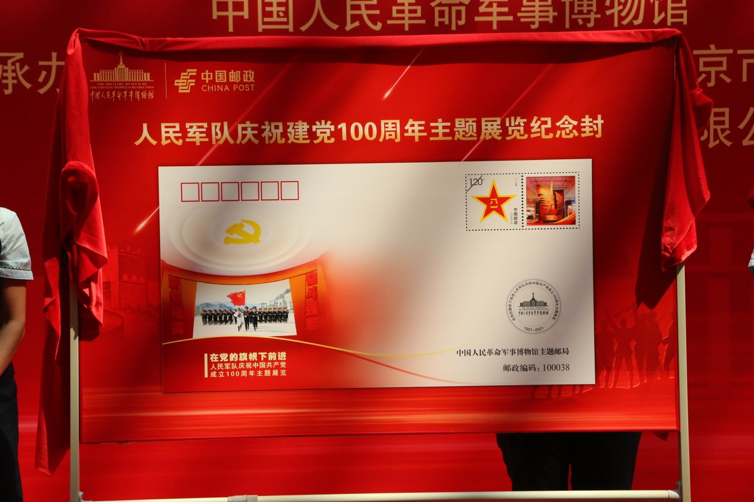 主題展覽紀念封以人民軍隊慶祝中國共產黨成立100周年主題展覽序廳為主要元素,配以明朗線條勾畫的鮮紅旗幟,凸顯人民軍隊在黨的旗幟下前進的展覽主題。