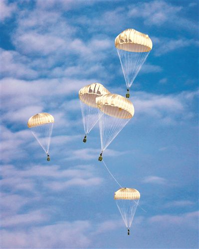 幾十分鐘后,飛機抵達預定空域,機艙尾門緩緩打開,數十件物資裝備首先被投出機艙,安全降落在空降場內。