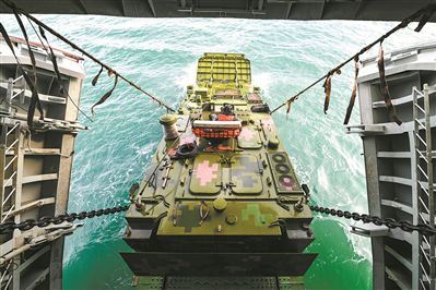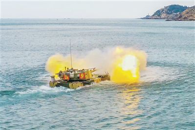 官兵駕駛兩棲裝甲車開展海上訓練。