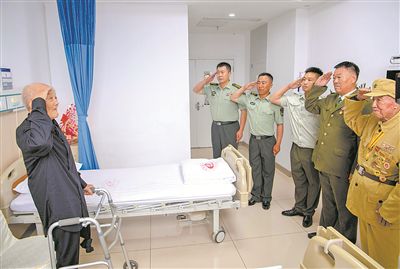 一些部隊官兵和退役軍人代表到醫院看望張富清(左一)。湖北省軍區政治工作局提供