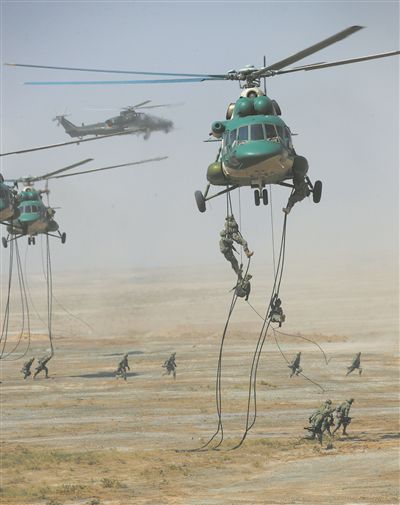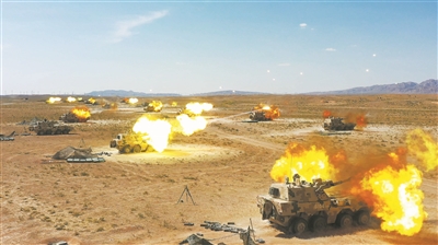 分批輪進、精確打擊、飽和轟炸……實兵演練中,在預警機的指揮下,我軍殲-20、殲轟-7A、殲-16、殲-11戰機以及俄軍蘇-30戰機,對“恐怖分子”營地實施空中突擊。超低空突防的直-10武裝直升機,分批次按照品字隊形躍升俯沖攻擊。隨后,地面炮兵群對“敵”實施全縱深、多方向、高強度、波浪式飽和火力突擊,全面壓制毀癱“敵”作戰體系。