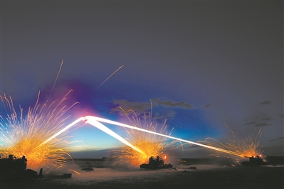 高炮夜間集火射擊。