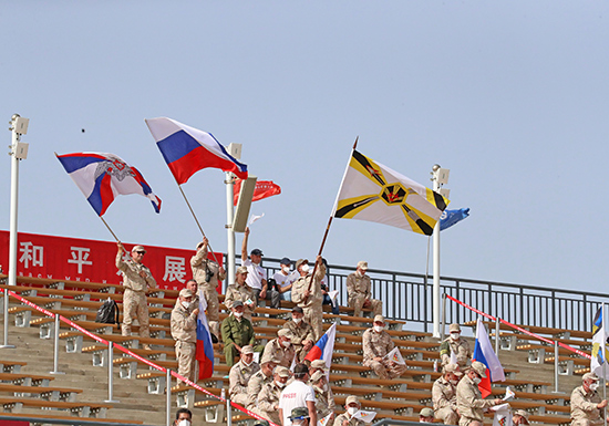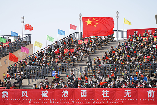 8月22日,“國際軍事比賽-2021”中國庫爾勒賽區在“蘇沃洛夫突擊”比賽場正式開幕,觀賽官兵歡呼。張永進攝