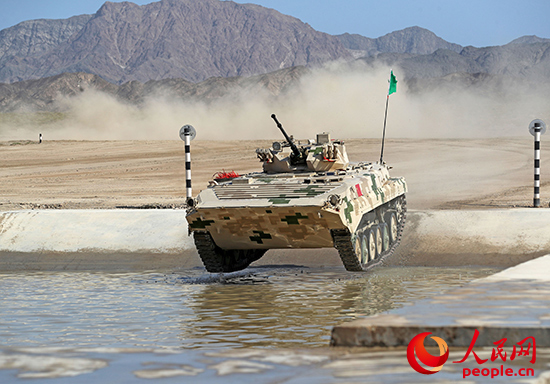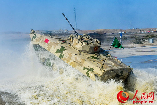 中國參賽隊員駕駛步戰車駛出涉水場。王俊攝