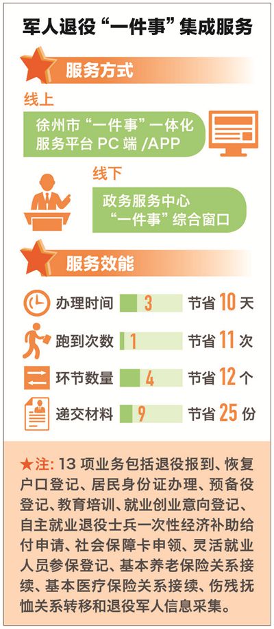 “各部門數據共享、文件證明通用,退役軍人返鄉辦理手續不用來回跑!8月22日,江蘇省徐州市退役軍人事務局、軍分區政治工作處、公安局、人力資源和社會保障局、醫療保障局、大數據管理中心、政務服務管理辦公室等7個部門聯合印發《關于徐州市推進軍人退役“一件事”改革實施方案的通知》,在全市推開軍人退役“一件事”集成服務。