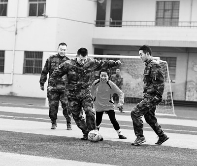 陸軍第83集團軍某旅官兵與駐地學生進行足球游戲。賈方文攝/光明圖片