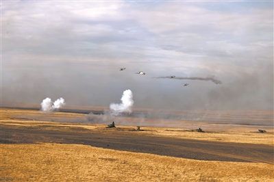 11時許,演練正式開始。記者站在觀禮臺遠望,空地結合、立體縱深的演練場面震撼人心——碧空之下,戰機呼嘯而過,一枚枚導彈對“敵”重要目標展開精確攻擊;低空掠過,武裝直升機對“敵”裝甲目標實施密集火力打擊;索降隊員從運輸直升機迅速滑下投入戰斗;地面作戰集群在茫茫曠野卷起陣陣煙塵……