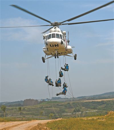 在武裝護衛課目演練中,中國參演官兵快速實施索降。