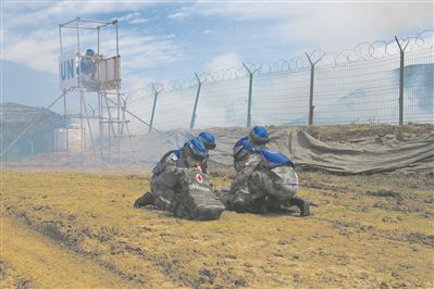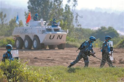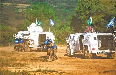 中國參演官兵在保護平民課目演練中清查周邊場地。