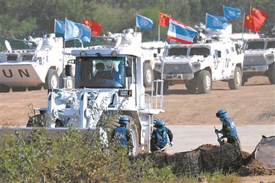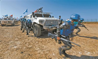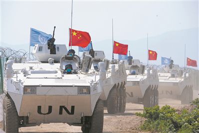 中國參演官兵駕乘裝甲輸送車向目標地域行進。