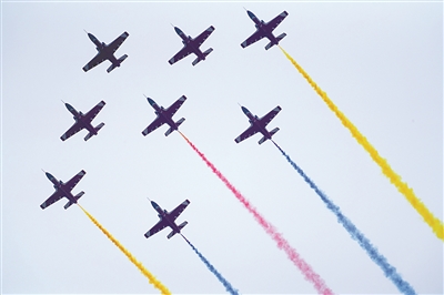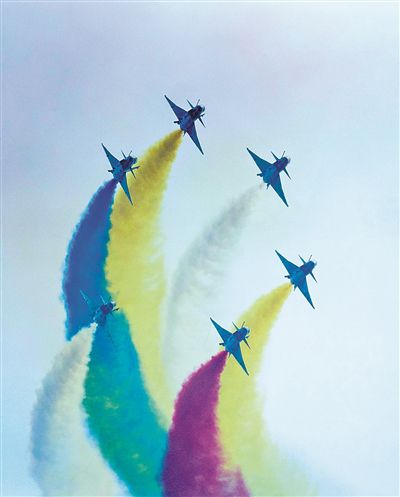 “八一”飛行表演隊進行特技飛行表演。欒鋮攝