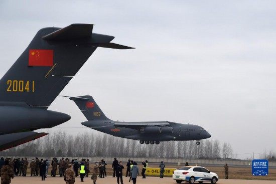 2020年2月13日,一架運送軍隊醫護人員的運-20運輸機在武漢天河機場降落。新華社記者 黎云 攝