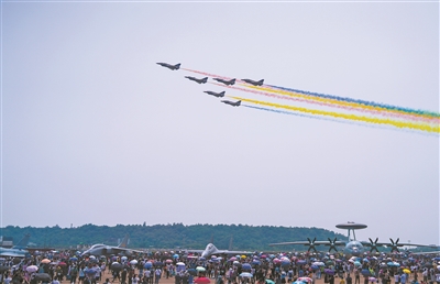 飛行結束后,“八一”飛行表演隊舉辦了“藍天儀仗向祖國致敬”儀式,10名飛行員手舉國旗繞場一周!白鎳f歲!”一位來自深圳的觀眾激動地說,今天在航展現場飄揚的“中國紅”,彰顯中國力量,展現中國志氣,讓大家無比自豪。