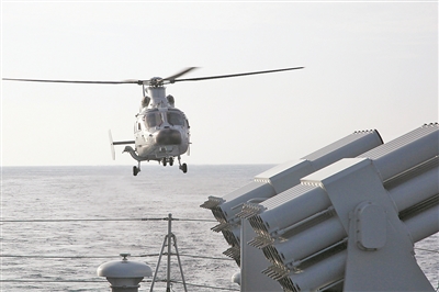 “上級通報,我海區有‘敵’潛艇活動,命我艦與直升機協同對其展開搜索與攻擊!甭劻疃鴦,艦機迅速進行協同訓練。在直升機引導下,艦艇對水下潛艇展開有效攻擊……