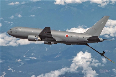 目前,日本已向美國訂購147架F-35戰機。為確保這些戰機更好發揮作戰能力,自2015年開始,日本自衛隊陸續向美國波音公司訂購4架KC-46A空中加油機,總價為8.01億美元。KC-46A也是在波音767客機基礎上改進而來,但配備更先進的全景式空中加油視覺系統。操作人員可利用3D成像技術,觀察加受油機相對位置。其最大載油量從原先的72噸增至96噸,并設置了硬軟兩種加油裝置。