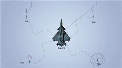 據《海軍航空愿景2030-2035》文件顯示,“下一代戰斗攻擊機”將比現役F/A-18E/F“超級大黃蜂”艦載戰斗攻擊機航程更遠、速度更快。該機將集成主/被動傳感器,搭載未來遠程空射武器,并與掛載導彈的無人機組成有人-無人編組作戰體系。這一設計在F/A-XX項目作戰示意圖中也有所體現。一架F/A-XX戰斗機控制4架無人機,包括2架負責進攻的空戰型無人機(A/A)、1架擔任支援的電子戰無人機(EW)和1架指揮控制無人機(C2)。F/A-XX戰斗機位于進攻陣型中央,負責指揮和發起進攻。