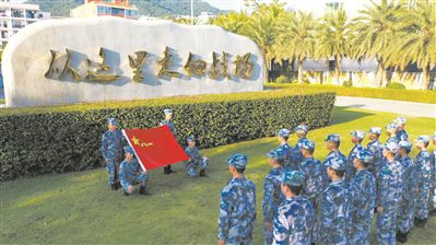 海軍某聯合訓練基地官兵在軍旗下宣誓。吳永華攝