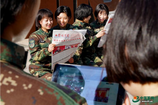 火箭軍某基地官兵通過《解放軍報》學習十九屆六中全會精神。柴永祥攝